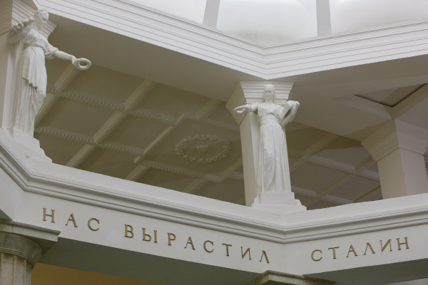 Строки гимна с упоминанием Сталина сегодня можно увидеть в вестибюле станции московского метро "Курская" (Кольцевая линия). После XX съезда КПСС слова о том, что "Нас вырастил Сталин", были изъяты с балок, украшающих открытую в 1950 году станцию. Однако реконструкцию, которую проводили на "Курской" в конце 2000-х, было решено осуществлять по принципу возвращения исторического облика. Строки из первого текста Михалкова и Эль-Регистана вновь появились в интерьере станции в 2009 году.