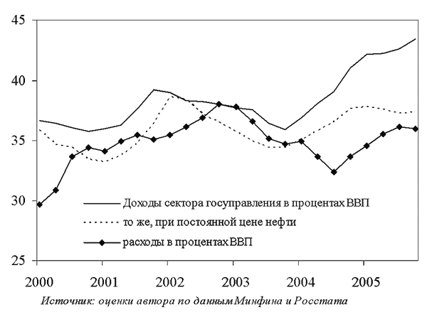 По оценкам минфина, рост непроцентных расходов удастся привязать к ВВП в 2008-2009 годах. В 2005-2006 годах этого сделать не удавалось, одно только повышение цены отсечения с 20 до 27 долларов за баррель в 2006 году приведет, как ожидается, к росту непроцентных расходов на 350 миллиардов рублей. Скорее всего чуть-чуть выше темпов роста ВВП будет прирост непроцентных расходов и в 2007 году. Между тем сам номинальный ВВП под действием роста цен на нефть в последнее время растет колоссальными темпами (например, в долларовом эквиваленте по обменному курсу - порядка 35 процентов в год), так что по отношению к "не нефтяному" ВВП бюджетные аппетиты растут чрезвычайно быстро и дефицит бюджета без учета доходов от нефти стремительно увеличивается.