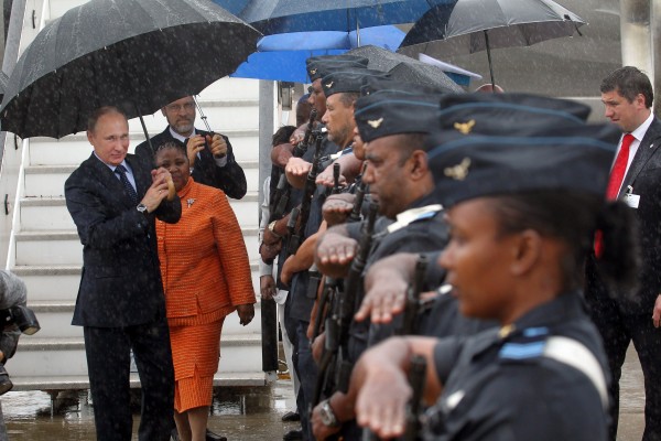 Под проливным дождем, держа в руках черный зонт, российский лидер спустился с трапа, чтобы отправиться в Центр международных конференций "Чиф Альберт Лутули" для беседы с президентом ЮАР Джейкобом Зумой.