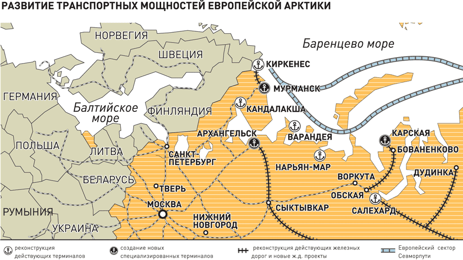Но для того чтобы весь этот объем перевезти, необходима портовая инфраструктура, где суда могут заправиться, произвести необходимый ремонт, сменить экипаж и т.д. Наготове должны быть и спасательные службы. Особенно если мы хотим переманить на СМП традиционные грузопотоки. Пока же из-за отсутствия удобств страхование грузов, отправляемых по СМП, настолько дорого, что выгоднее их все-таки везти кружным южным путем. Сервисно-спасательные пункты, считают эксперты, логичнее организовать в портах Диксон, Певек и Провидения.