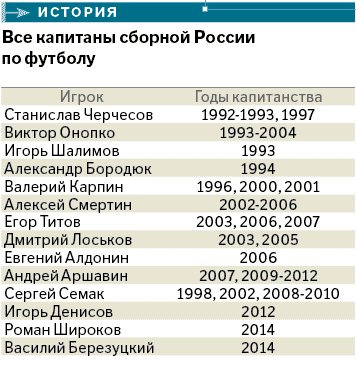 (Кроме того, в разное время эпизодически с капитанской повязкой на поле в форме сборной России выходили Дмитрий Харин, Юрий Никифоров, Дмитрий Аленичев, Андрей Тихонов, Игорь Добровольский, Игорь Колыванов, Александр Мостовой, Игорь Чугайнов, Сергей Овчинников, Дмитрий Хохлов, Алесей Березуцкий, Игорь Семшов, Вячеслав Малафеев).