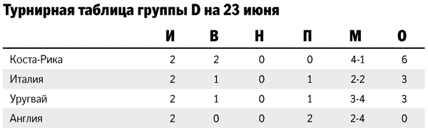 Добавим, что судьба второй путевки в плей-офф в группе D решится завтра в 20.00 по московскому времени в поединке между Уругваем и Италией. Для выхода в плей-офф латиноамериканцам нужна только победа, ну а "Скуадру адзурру" устроит и ничья.