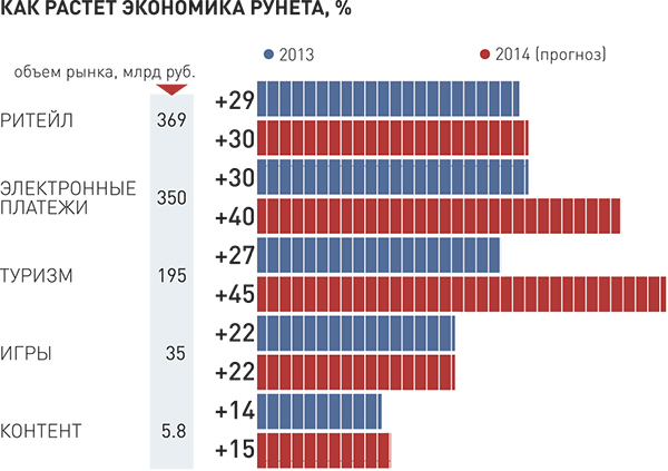 В целом экономика отечественного сегмента глобальной Сети в 2014 году должна вырасти на 30 процентов, считают эксперты. А объем экономики интернет-зависимых рынков, традиционно оцениваемых экспертами РАЭК в рамках исследования, составил по итогам 2013 года более 6,7 триллиона рублей, что сравнимо с 10 процентами ВВП.