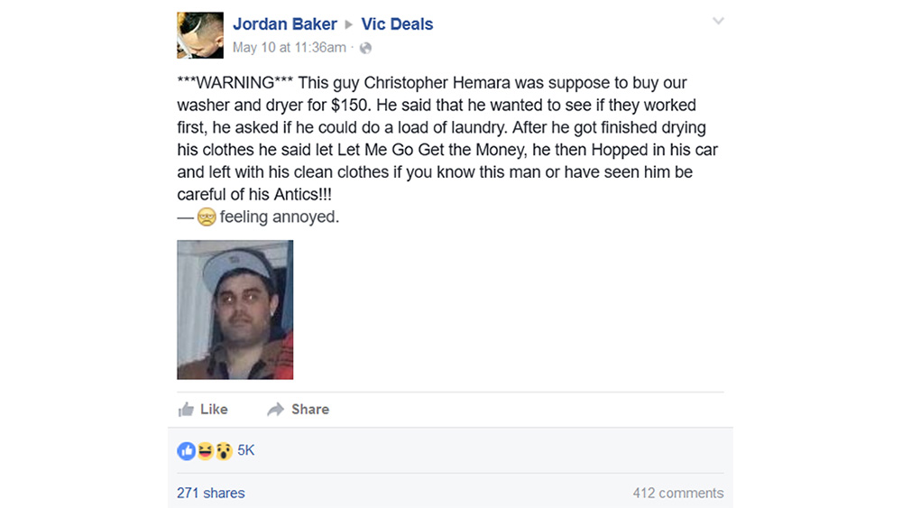 "Внимание! Этот парень, Кристофер Хемара, собирался купить нашу стиральную машину и сушилку за 150 долларов. Когда он приехал, то попросил проверить их в работе, и положил туда свое белье. Когда одежда была постирана и высушена, он сказал, что сходит за деньгами, после чего прыгнул в машину и сбежал со своей чистой одеждой. Если вы знаете этого человека или видели его, будьте осторожны, он способен на такие выходки!" - написал недовольный продавец стиральной машины.