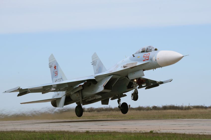 Су-27 - российский тяжелый истребитель завоевания господства в воздухе. Экипаж два человека, максимальная скорость 2500 км/ч. Бортовая электроника обнаруживает цели на дистанции 150 километров и способна сопровождать до 10 целей одновременно. Самолет может нести 12 ракет класса "воздух-воздух", в правом крыле у фюзеляжа спрятана 30-миллиметровая скорострельная пушка с наведением по РЛС.