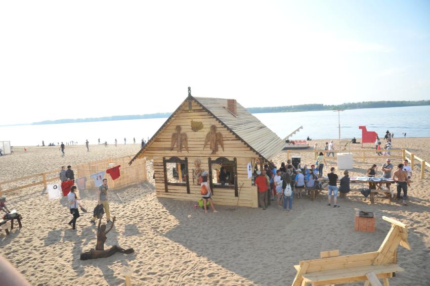 Организаторы фестиваля говорят, что их главная цель - изменить привычное представление о подходах к организации городского пространства и досуга. Так, участники из Ижевска поставили избушку на песке возле воды. К ней не спустился только ленивый. Умельцы даже настоящую печь сложили из красного кирпича с дымоходом. В печи они выпекали удмуртское блюдо - лепешки, которые едят с молочным или томатным соусом, и перепечи (открытые пирожки с капустной начинкой. - Прим. ред). Кстати, тесто замешивали тут же - возле печи. Запомнилось также шоу удмуртских гостей, где лодка, стилизованная под зубастую рептилию, "сражалась" с помощью выстрелов брандспойта с красной скульптурой коня, извергавшего огонь.