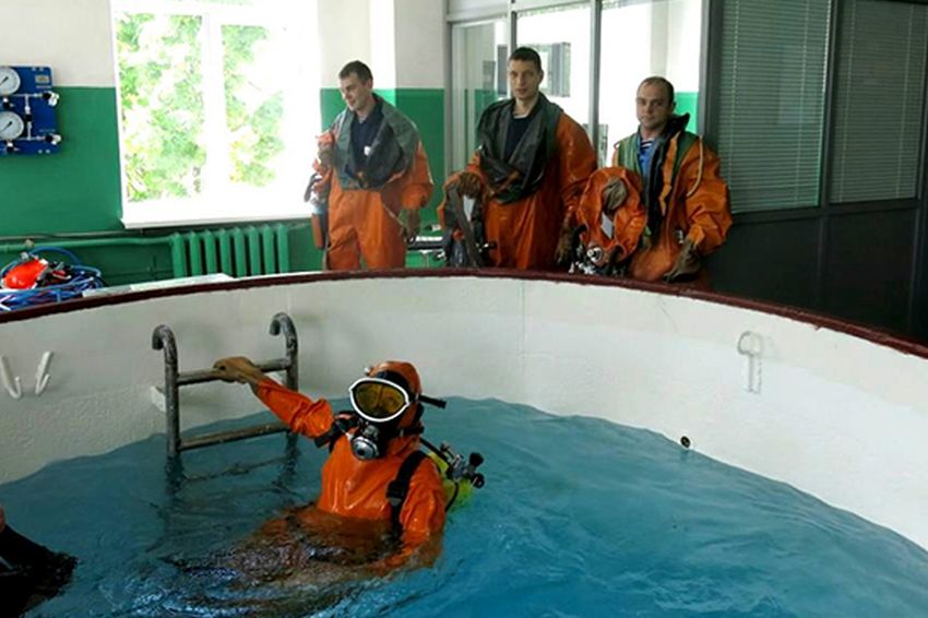 Практическую отработку навыков спасения из затонувшей субмарины подводники проходили в научно-исследовательском институте спасания и подводных технологий Военного учебно-научного центра Военно-Морского Флота "Военно-морская академия имени адмирала флота Советского Союза Кузнецова".