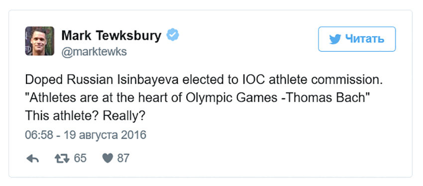 Реакция пользователей Twitter оказалась практически молниеносной - спустя считанные минуты блогеры, в большинстве своем живущие в России, обрушились на Тьюксбери с критикой и встречными обвинениями. Пловца назвали "неудачником с одной медалью" и "лжецом". Кроме того, пользователи рассказали спортсмену, что Елена Исинбаева никогда не обвинялась в употреблении допинга.