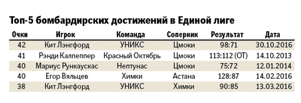 У лучших снайперов Единой лиги еще предостаточно бомбардирских ориентиров. Рекорд чемпионатов России принадлежит Захару Пашутину, брату рулевого УНИКСа. В декабре 1998-го, выступая за саратовский "Автодор", он "отгрузил" 55 очков "Локомотиву" (Минеральные Воды). Если говорить о высшем достижении в национальных чемпионатах, с учетом происходившего в союзном первенстве, то в 1977-м центровой тбилисского "Динамо" Николай Дерюгин в проигранном матче с ЦСКА (100:110) удивил столичную публику 59 очками.
