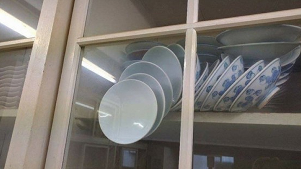 В социальных сетях стала популярной фотография, которую опубликовал на сайте Reddit один из пользователей. На снимке изображен кухонный шкаф, с полок которого упала часть тарелок. Если дверцу шкафа открыть - тарелки упадут на пол и разобьются.