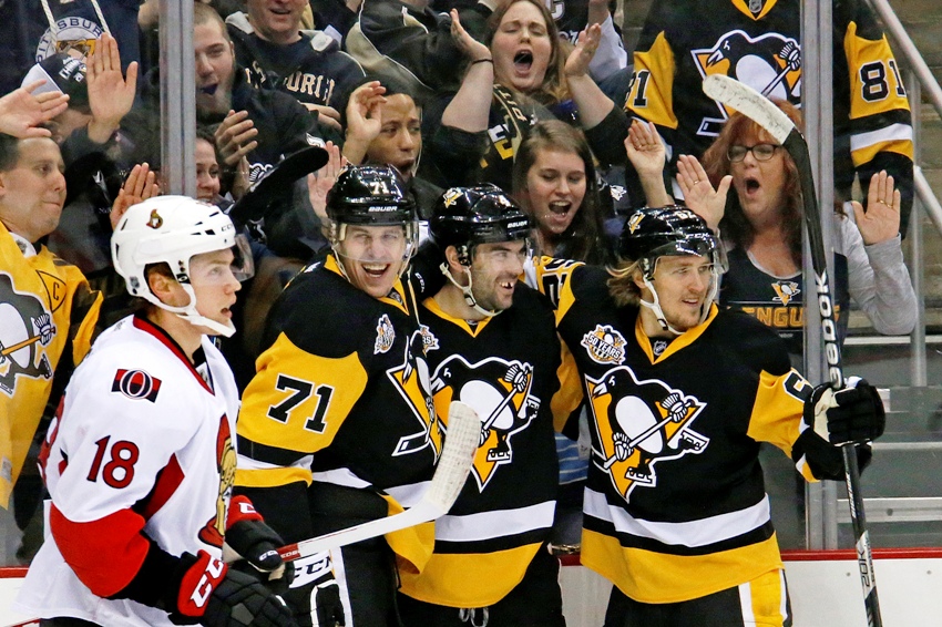 Начало встречи осталось за хозяевами - уже на второй минуте Брайан Раст распечатал ворота "сенаторов", а асситировал ему Евгений Малкин. Это было первое очко россиянина в матче, но далеко не последнее. До первого перерыва болельщики увидели еще три шайбы, после 20 минут встречи счет был 2:2.