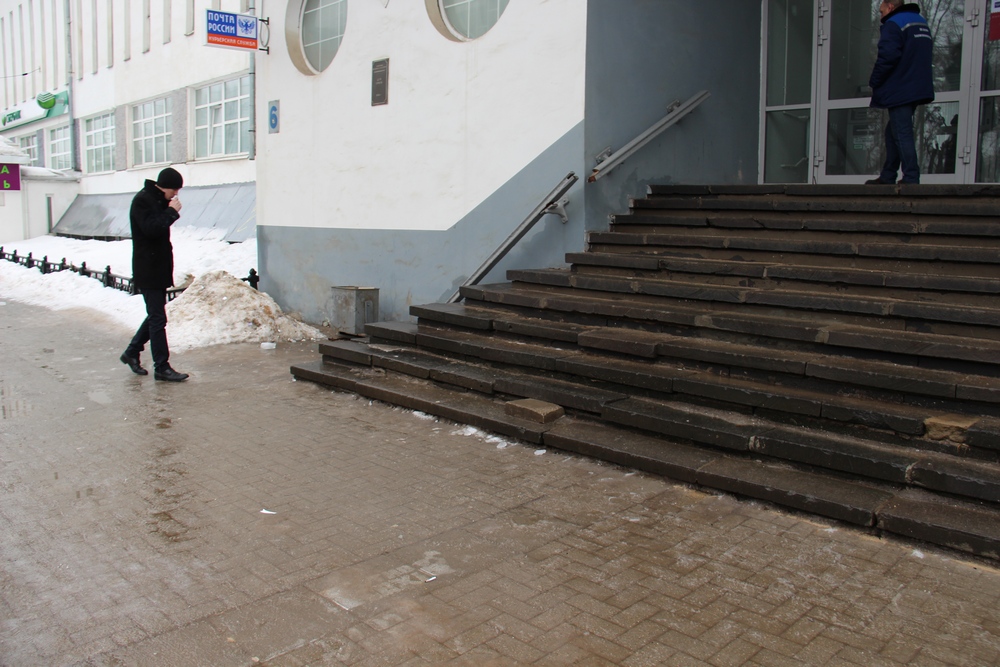 Очевидцы ЧП обратили внимание на плачевное состояние перил и ступеней почтамта, имеющих следы серьезных повреждений. На входе в здание, которое ежедневно посещают пенсионеры и инвалиды, отсутствует пандус. На некоторых ступенях есть трещины и лежат довольно крупные обломки камней.