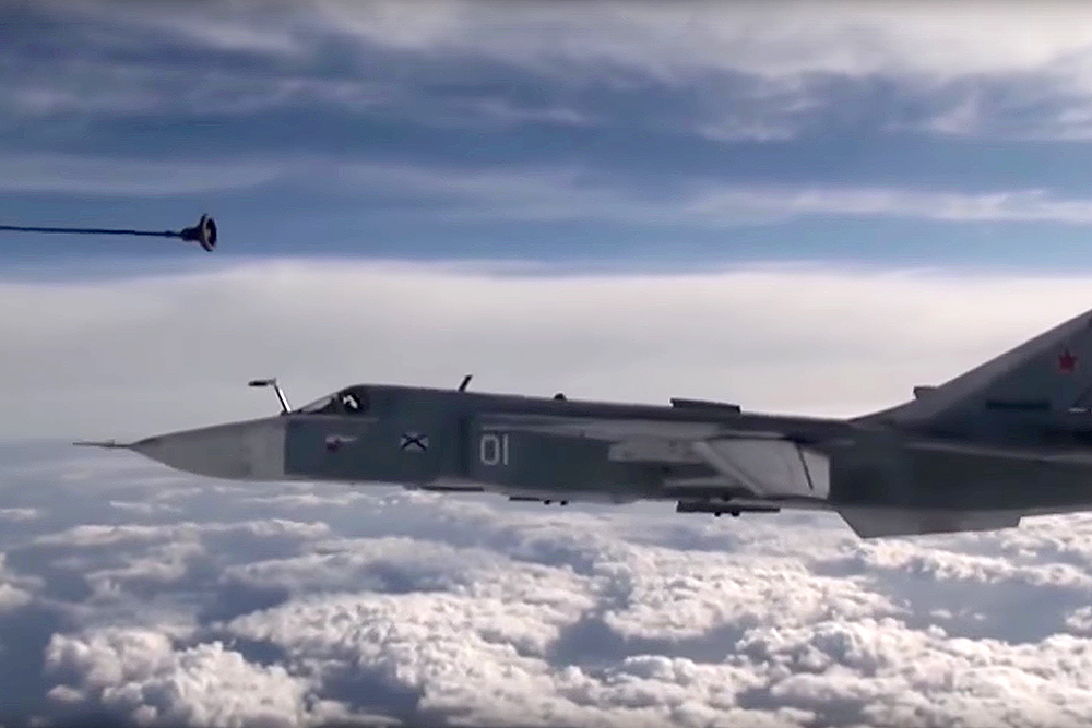 Минобороны России на своем канале в YouTube опубликовало видеозапись дозаправки бомбардировщика Су-24М морской авиации с летающего танкера Ил-78.
