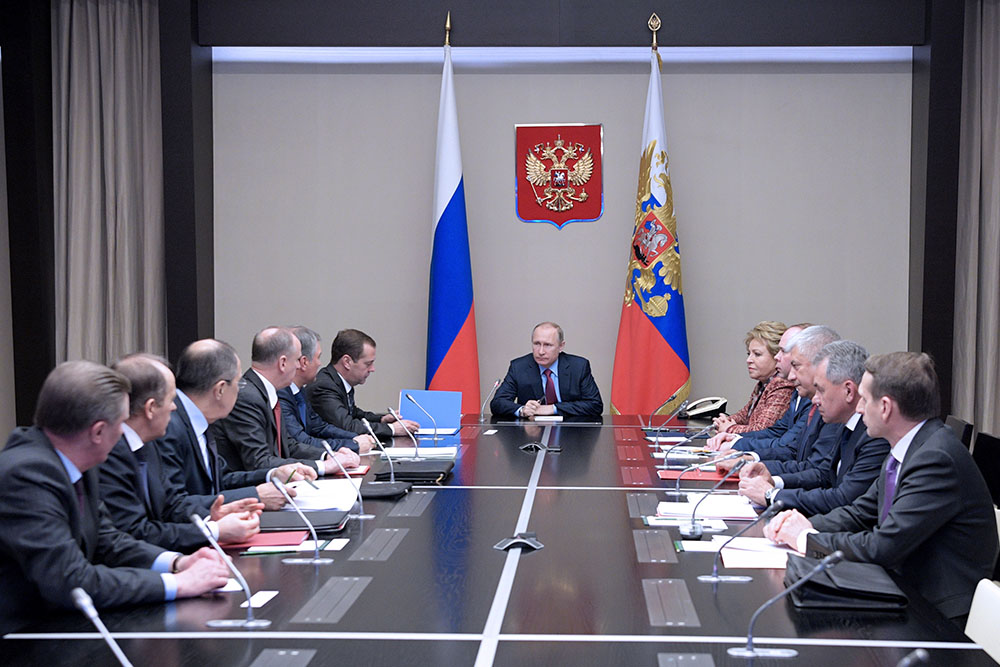 В совещании приняли участие премьер-министр Дмитрий Медведев, спикеры обеих палат парламента Валентина Матвиенко и Вячеслав Володин, глава администрации Кремля Антон Вайно, секретарь СБ РФ Николай Патрушев, министр внутренних дел Владимир Колокольцев, министр иностранных дел Сергей Лавров, министр обороны Сергей Шойгу, директор ФСБ Александр Бортников, глава СВР Сергей Нарышкин, спецпредставитель президента по вопросам природоохранной деятельности, экологии и транспорта Сергей Иванов.