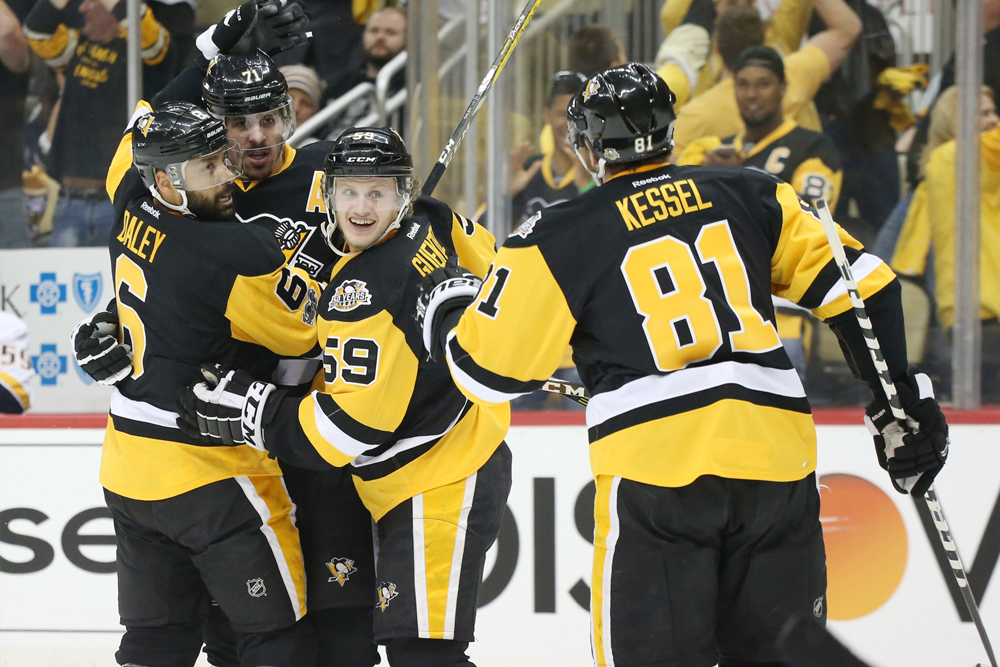 Счет в матче на 16-й минуте открыл россиянин Евгений Малкин, реализовав большинство 5 на 3. После этого в течение четырех минут в ворота гостей влетело еще две шайбы - отличились Конор Шири и Ник Бонино.