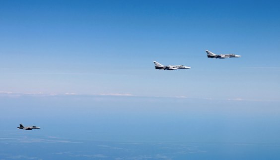 Тем не менее ВВС Финляндии и Швеции подняли на сопровождение россиян свои истребители F-16, F-18 и JAS-39. Это было сделано "для идентификации и фотографирования российских самолетов", сообщили финские ВВС. Финскому F-16 удалось даже попасть на один снимок с Су-24.
