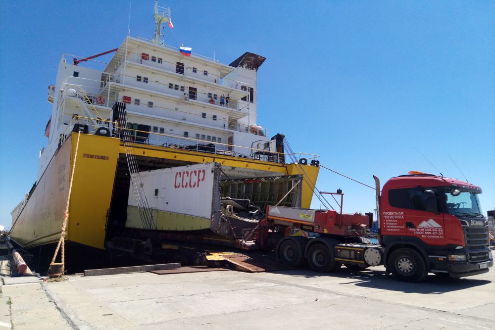 Не самой легкой задачей оказалось и подобрать подходящий для перевозки морем транспорт. Ведь разобранный макет погрузили на восемь специализированных многоосных тралов. Причем некоторые его части достигли шести метров в ширину и 5,5 метра в высоту. В результате огромный экспонат будущей экспозиции о космосе взял на борт в порту Темрюк сухогруз "Александр Ткаченко".