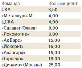 На данный момент не видно, кто из остальных команд смог бы достойно конкурировать с двумя армейскими "монстрами". Последние два года в роли противовеса более-менее удачно выступал магнитогорский "Металлург". Букмекеры по инерции и "Магнитку" внесли в тройку главных претендентов на титул. Однако уже в межсезонье было видно, что команде Ильи Воробьева придется непросто. Магнитогорск потерял целый ряд ключевых игроков, среди которых Данис Зарипов, ведущая пара защитников Ли-Береглазов и форвард Антипин.