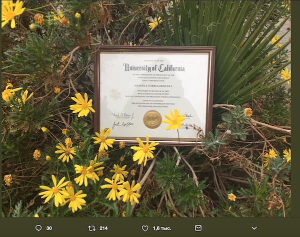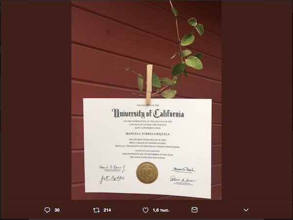 Мануэла Торрес-Орехуэла опубликовала в Twitter-аккаунте фотографии своего диплома, которые были сделаны ее матерью. Необычная "фотосессия" насмешила пользователей Сети.