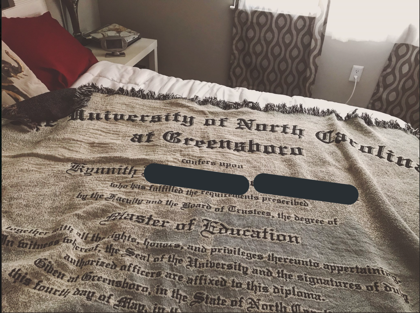 Девушка с ником GrooviK опубликовала в Twitter фотографию необычного одеяла. На ткани был вышит текст из ее диплома о высшем образовании.