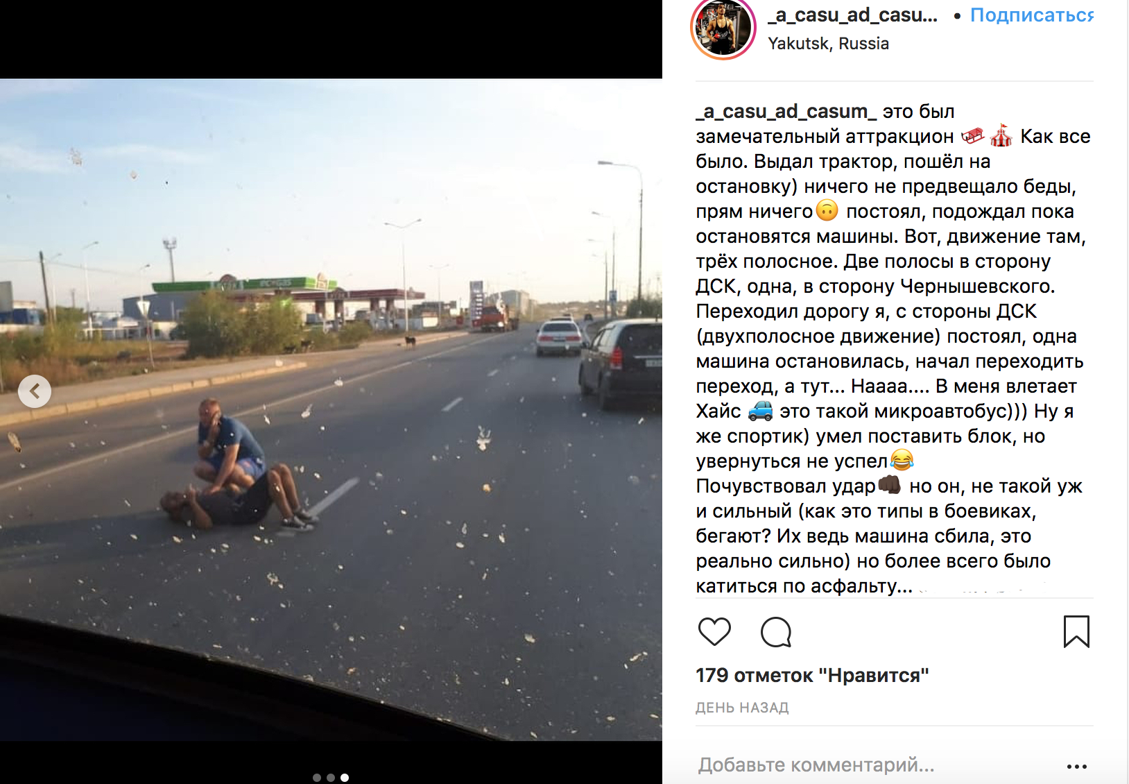 Блогер из Якутии Алексей Андреев опубликовал в своем Instagram-аккаунте селфи с места ДТП. Мужчина пострадал в этой автоаварии и лежал на асфальте с вывихнутой ключицей.