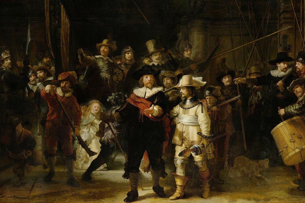 Групповой портрет размером примерно 3,5 на 4,5 метра "Выступление стрелковой роты капитана Франса Баннинга Кока и лейтенанта Виллема ван Рейтенбюрга", более известный под названием "Ночной дозор", был написан Рембрандтом в 1642 году по заказу Стрелкового общества - отряда гражданского ополчения. Эту работу искусствоведы считают вершиной творчества Рембрандта.