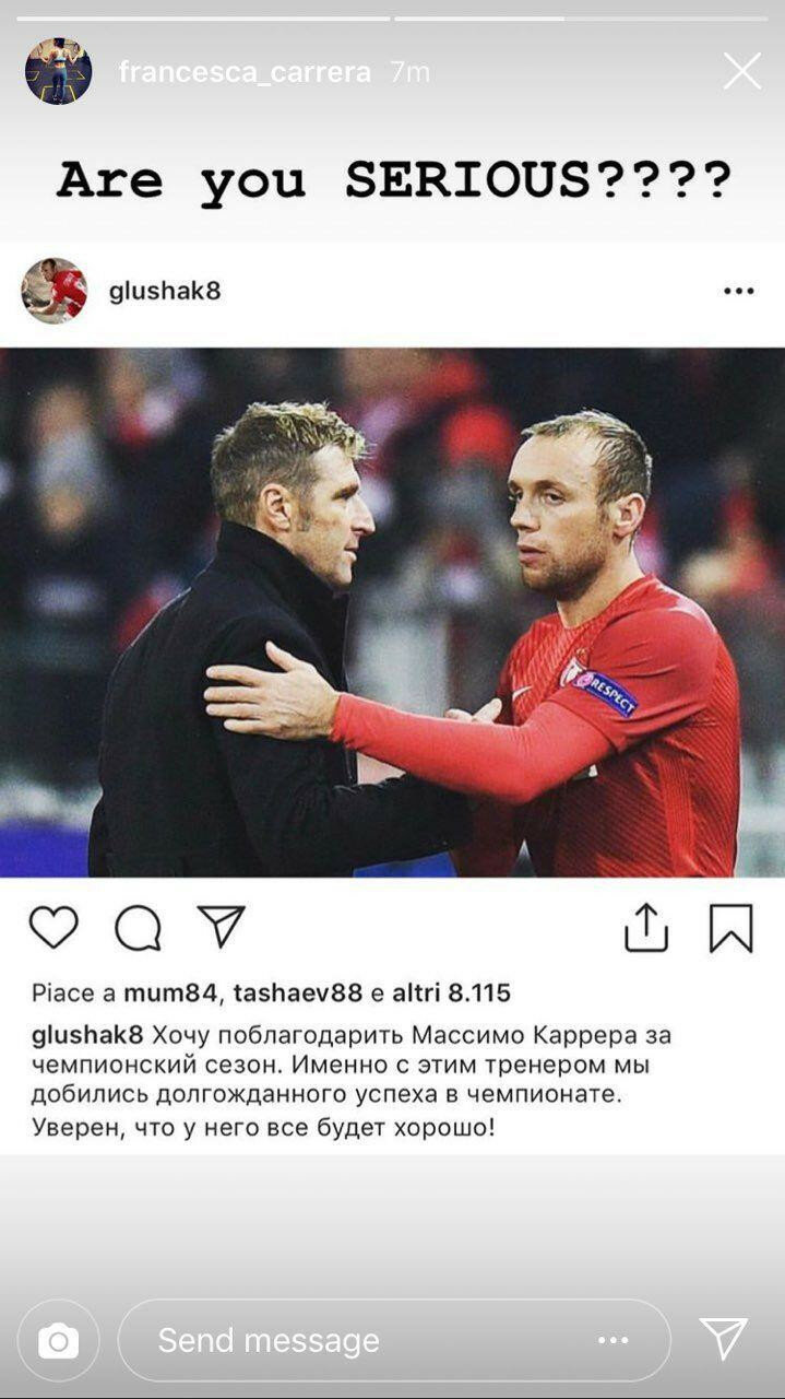 В сентябре Каррера отстранил от работы с первой команды Глушакова и Андрея Ещенко. По неофициальной информации, он сделал это из-за того, что игроки лайкнули в Instagram пост известного актера и болельщика "красно-белых" Дмитрия Назарова, который в стихотворной форме раскритиковал Массимо после домашнего поражения от "Ахмата" (1:2) в чемпионате России.