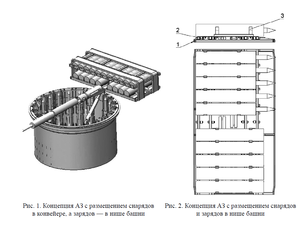 Советские конструкторы тоже экспериментировали с подобными автоматами заряжания. Они разработали гибридную схему, при которой невзрывоопасные снаряды размещались в карусели, в то время как заряды хранились в отдельном отсеке с вышибными панелями. Преимущество данного варианта заключается в том, что он позволяет уменьшит размер башни.