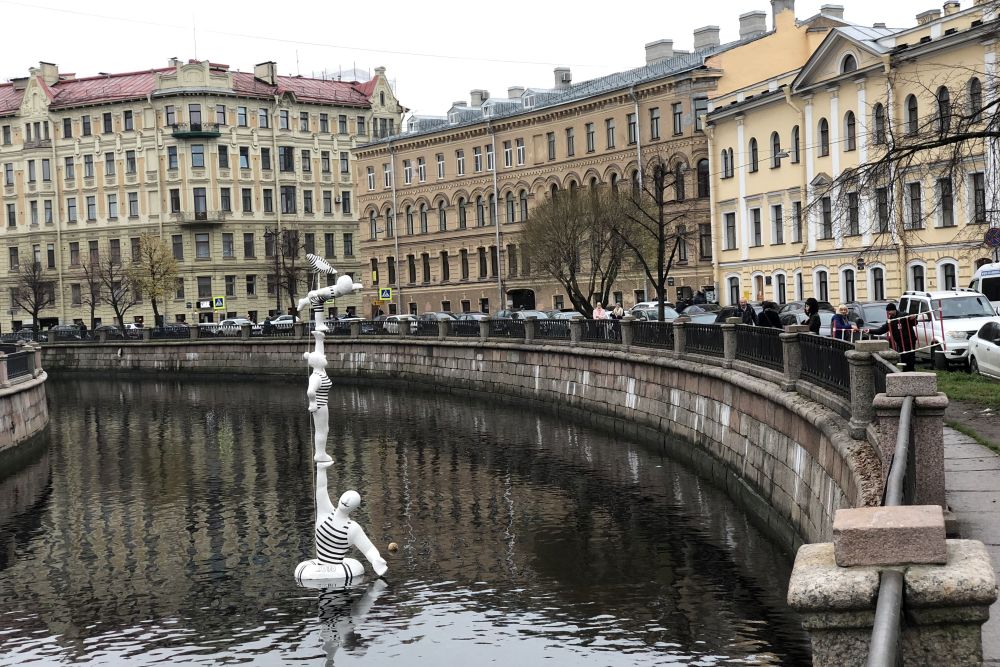 В историческом центре Санкт-Петербурга на канале Грибоедова недалеко от Львиного мостика появился необычный арт-объект - семья акробатов в полосатых костюмах. Папа, мама и ребенок, покачиваясь на воде, стоят друг у друга на плечах.