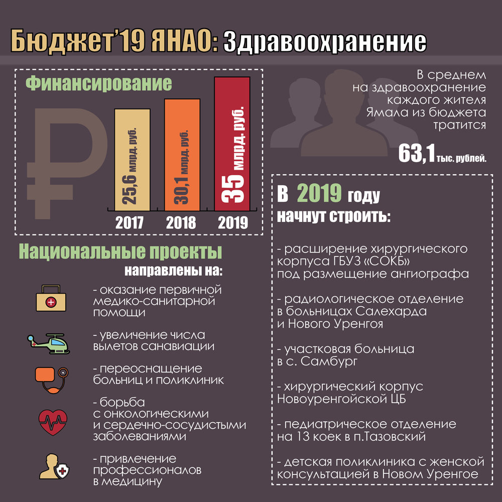 Доля собственных доходов ЯНАО очень высока - 171,09 млрд рублей. Округ обладает высокой инвестиционной привлекательностью и безупречной кредитной историей. На реализацию 27 госпрограмм будет направлено 96% бюджетных средств. Заметно увеличивается финансирование отраслей, связанных с качеством жизни населения. Так, доля средств, выделенных на здравоохранение, в 2019 году вырастет на 20% - до 35 млрд рублей с учетом ФОМС. На образование будет направлено на треть больше средств - 29,4 млрд рублей, при этом деньги пойдут в первую очередь на увеличение зарплат учителям.