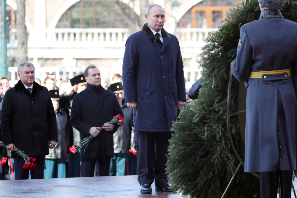 Владимир Путин подошел к венку и постоял, отдавая дань уважения погибшим защитникам Родины.