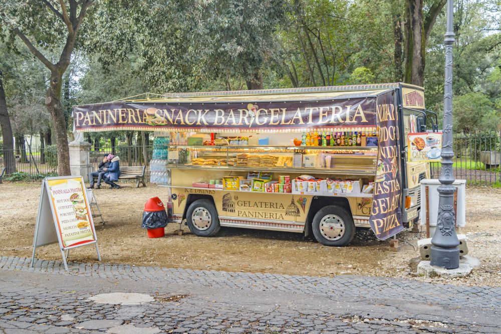 Популярные среди гостей Рима кафе на колесах можно увидеть на всех основных туристических маршрутах. В основном там работают выходцы из стран Юго-Восточной Азии. Цены на продукцию здесь в два раза выше, чем в стационарных заведениях, а качество еды оставляет желать лучшего.