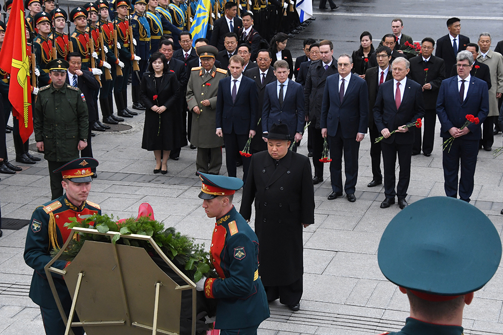 После лидера КНДР цветы к мемориалу возложили высокопоставленные российские дипломаты, сопровождающие Ким Чен Ына, и члены корейской делегации.