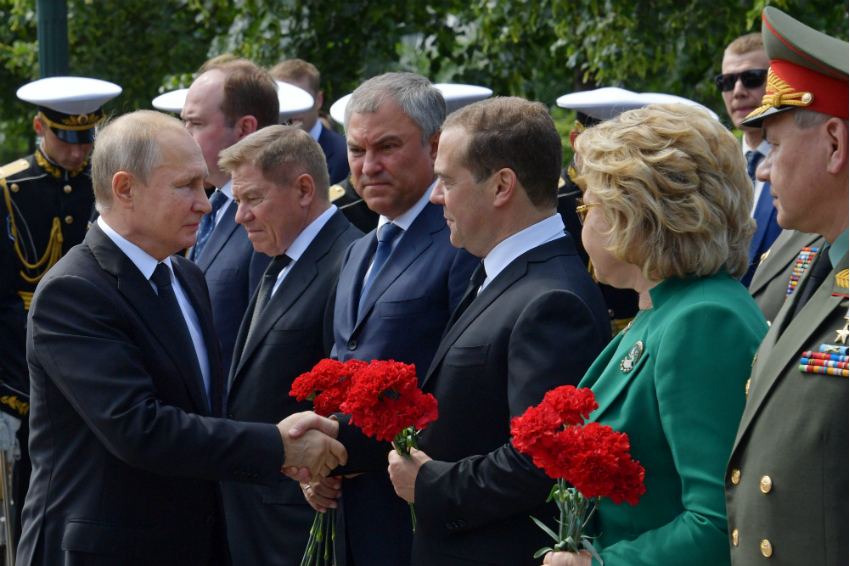 Вместе с главой государства почтили память павших в Великой Отечественной войне советских воинов ветераны, премьер-министр Дмитрий Медведев и члены правительства, руководство администрации президента, депутаты и сенаторы, руководство Вооруженных сил РФ, а также кадеты.