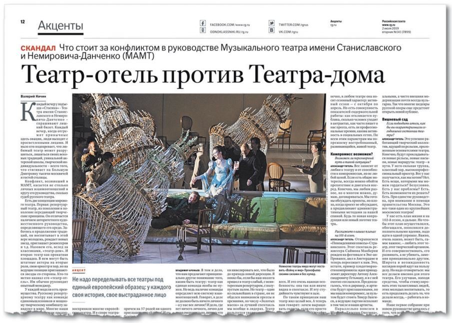 Публикация в "Российской газете", посвященная событиям, происходящим в Музыкальном театре имени Станиславского и Немировича-Данченко, меня потрясла. То есть буквально по Чехову: "на сцене люди обедают, пьют чай, а в это время рушатся их судьбы". Только в данном случае это я, как многие другие люди, обедаю, ничего не подозревая, пью чай, как многие сотни и тысячи верных поклонников Стасика (как по-доброму для краткости принято называть в разговорах этот московский театр), а в это самое время за стенами театра, внутри кто-то, то есть не кто-то, а нынешний директор театра, как нетрудно заключить из публикации "РГ", решает, в том числе и за меня его, театра, судьбу. Вернее - вернемся к Чехову! - не решает, а рушит судьбу театра.