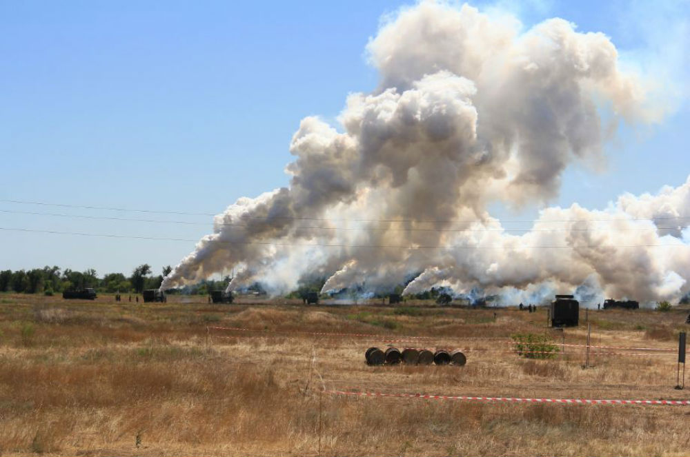 Специалисты войск радиационной, химической и биологической защиты скрыли свои войска дымовой завесой в рамках тактического учения на полигоне Прудбой под Волгоградом, сообщил начальник пресс-службы Южного военного округа Вадим Астафьев.