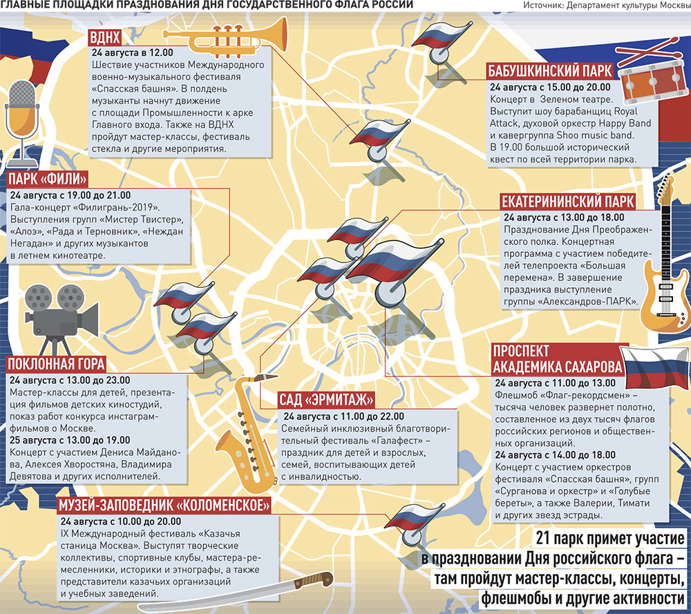Большую программу подготовила ВДНХ. Все дни на Центральной аллее будут идти фристайл-выступления рэп-исполнителей. В это время уличные художники будут устраивать перформансы и рисовать граффити. Эти шоу станут частью фестиваля "Ритм моего города", третья неделя которого посвящена стритстайлу. Бесплатная экскурсия, посвященная гербам и флагам, пройдет 23 августа. Это именно та символика, которую можно увидеть на многочисленных фризах, фронтонах и фасадах павильонов ВДНХ. Участников ждут в 12:00 у музея ВДНХ (арка главного входа). В этот же день в 19:00 перед павильоном № 1 "Центральный" гости посмотрят выступление коллектива Twisted Tubes из Манчестера. Они исполнят микс из множества композиций разных жанров. А все, кто придут 24 августа, увидят шествие участников Международного военно-музыкального фестиваля "Спасская башня". В 12:00 музыканты стартуют на площади Промышленности, далее отправятся по Главной и Центральной аллеям и финишируют у входной арки.