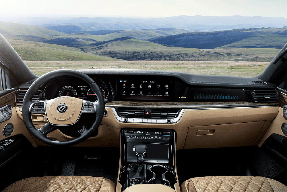 Дверные карты выполнены в стилистике флагманского седана Kia K900 и полностью лишают ощущения, что это тот самый рамный внедорожник Mohave. Переключатель режимов движения теперь выполнен в форме шайбы и расположен на тоннеле пола за селектором коробки передач. Режимов шесть: Comfort, Eco, Sport, песок, снег или грязь.