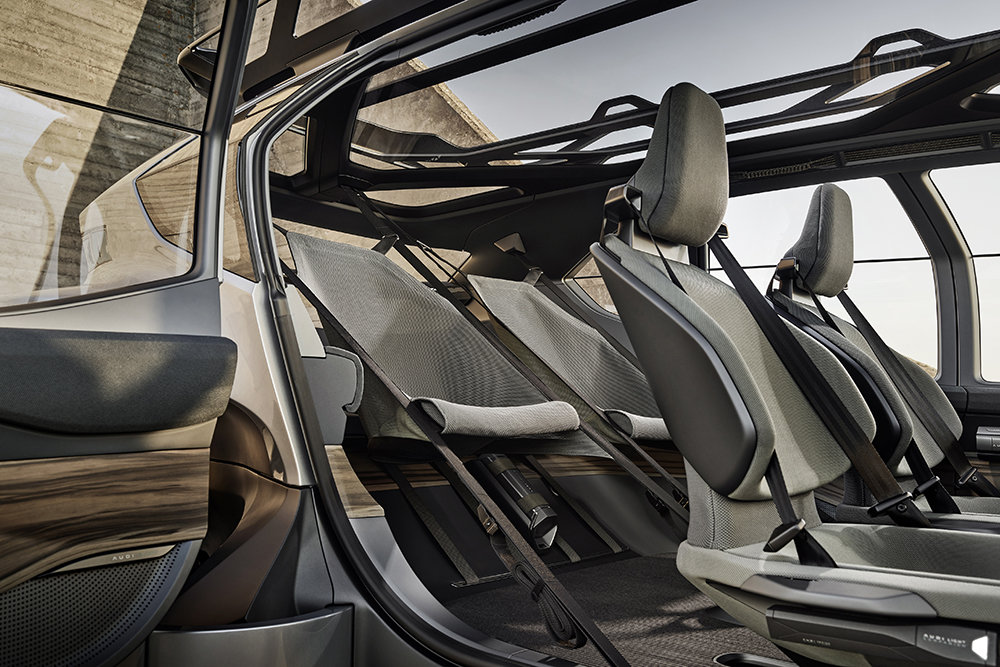 В салоне, как мы привыкли видеть на концептах последних лет, царит минимализм. Но в Audi решили возвести его в квадрат. Хотя бы потому, что у внедорожника нет тачскрина информационно-развлекательного комплекса - его заменяет смартфон. Задние кресла выполнены в виде гамаков (интересно, что сказали бы в Euro NCAP?) и основная их прелесть в том, что они мобильные: можно вытащить и использовать их как стулья на посиделках на природе.
