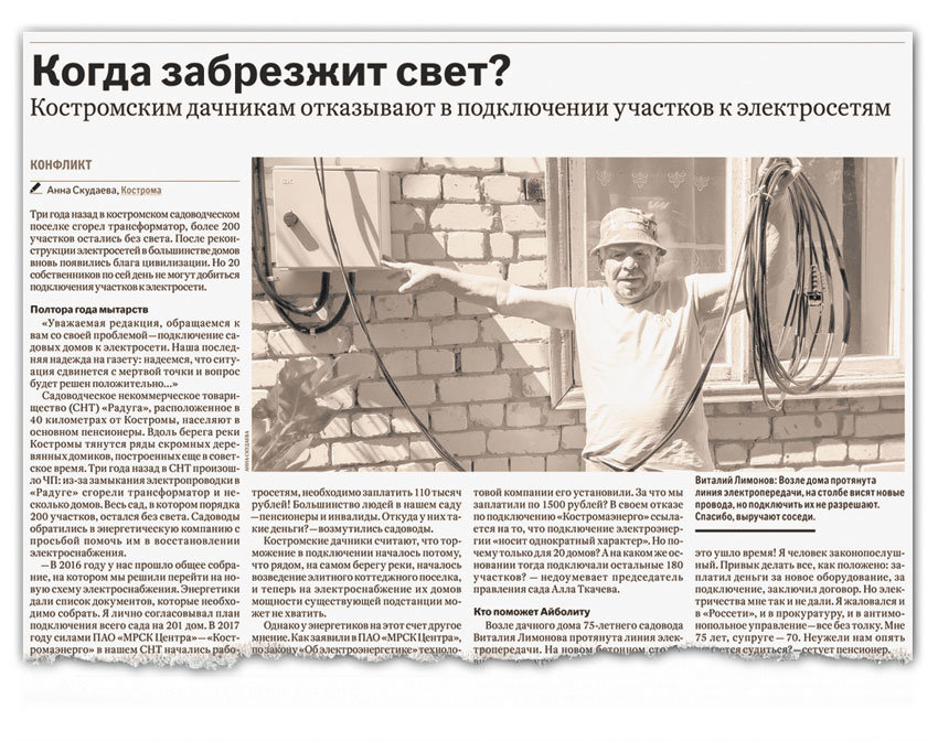 В филиале ПАО "МРСК Центра" - "Костромаэнерго" корреспонденту "РГ" пояснили, что были бы рады помочь, да законодательство изменилось, и теперь энергетики не могут завершить начатые работы без дополнительного пакета документов, собрать который большинство садоводов не в состоянии.