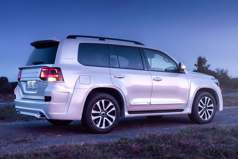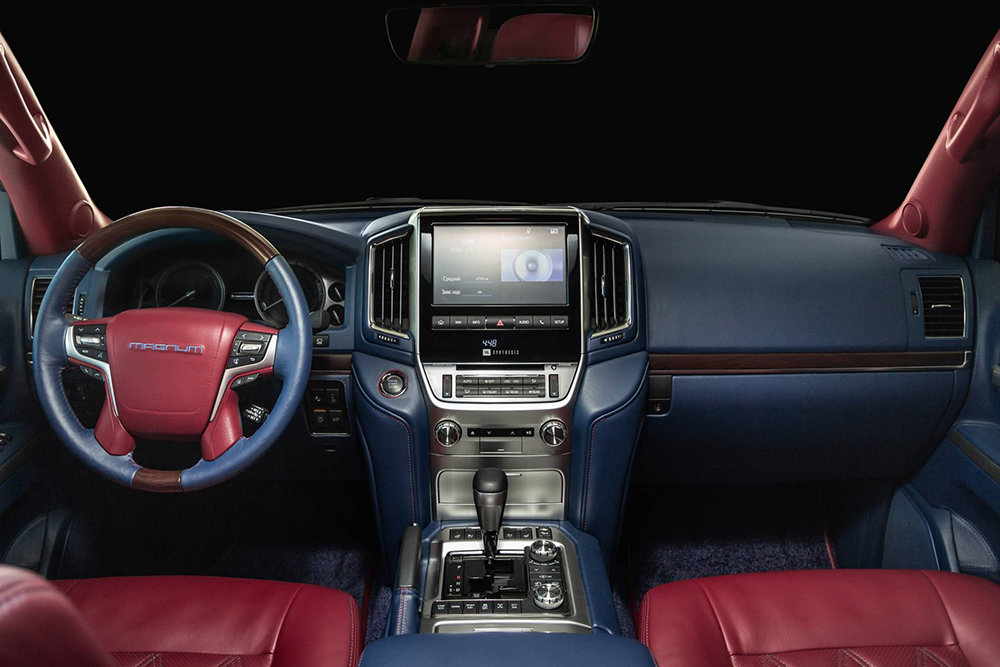 Снаружи на LC Cruiser надели боди-кит Dictator, благодаря чему машина стала на 100 мм шире. Таким образом автомобиль получил новые бамперы, расширители колесных арок, накладку на пятую дверь и абсолютно новый легкий капот. А завершила образ решетка радиатора из черного углепластика. Хрома в этом автомобиле не осталось совсем. Как, кстати, и логотипов Toyota или Land Cruiser 200. Теперь и спереди, и сзади, и даже на задних стойках красуются надписи Magnum.