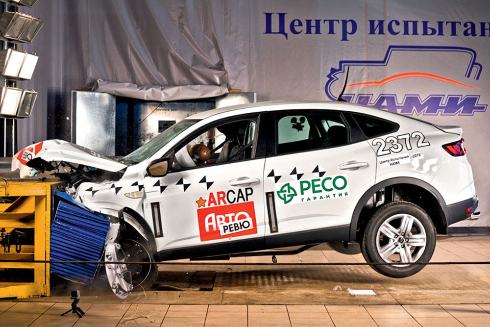 Удар был произведён на скорости 64.7 км/ч - на такой же скорости разбивали Hyundai Creta. Эксперты издания отмечают, что Arkana заметно крепче Renault Logan и соплатформенного Lada Xray Cross: дверной проём сократился всего лишь на 1 миллиметр. Передняя панель после удара осталась целой, рулевую колонку увело незначительно - на 14 мм вперёд от водителя, педали тормоза и сцепления - на 9 и 26 мм соответственно.
