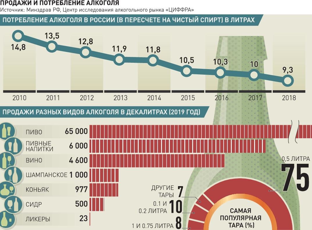 При всем этом статистика Минздрава России говорит об общем снижении потребления алкоголя в стране. Как сообщили в пресс-службе ведомства, если в 2008-м на душу населения в среднем приходилось 15,7 литра алкоголя в год, то в 2018-м - только 9,3. За тот же период снизилась и заболеваемость алкогольными психозами - с 70 до 32 случаев на 100 тысяч населения. Общее количество тех, кто состоит на учете с зависимостью от спиртного, сократилось с 2 до 1,3 млн человек.