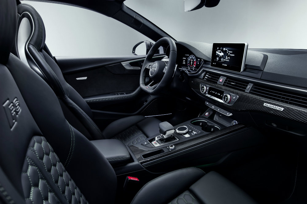 Из особенностей оснащения купе Audi RS 5 Sportback отметим фирменный полный привод quattro с межосевым дифференциалом, задний межколесный дифференциал со специальными настройками, спортивную подвеску RS plus с системой контроля демпфирования Dynamic Ride Control (DRC), а также систему динамического рулевого управления и спортивную систему отработавших газов RS.