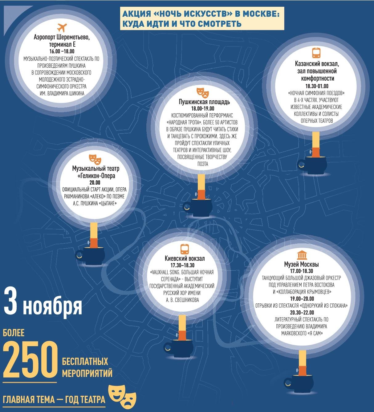 По словам главы столичного департамента культуры Александра Кибовского, во всех округах Москвы запланировано более 250 бесплатных мероприятий. Все посвящены Году театра. Тематические спектакли, концерты и перформансы подготовили музеи и театры, библиотеки и кинотеатры, парки и культурные центры. К искусству подтянулись и два железнодорожных вокзала с аэропортом. Первые мероприятия пройдут уже в полдень 3 ноября, остальные возьмут старт ближе к закату и продлятся до самого утра - так сказать, до последнего клиента. Официально же акция откроется в 20.00 в музыкальном театре "Геликон-опера", где покажут оперу "Алеко". Чтобы занять место в зрительном зале, нужно зарегистрироваться на сайте "Ночи искусств". Предварительной записи требуют и другие площадки.
