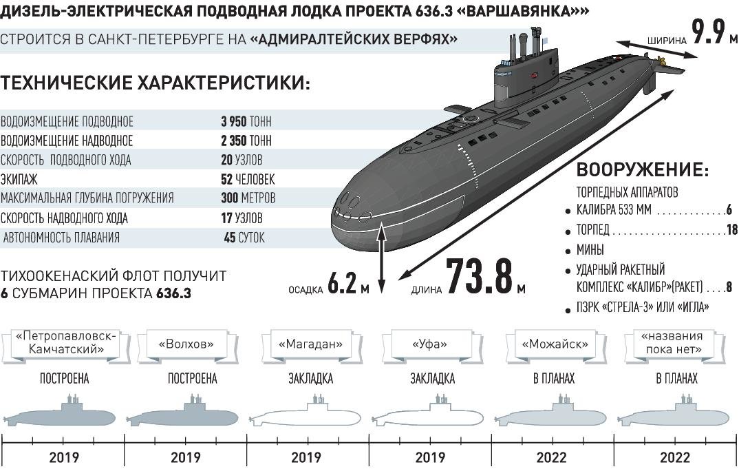 Первая субмарина - Б-274 "Петропавловск-Камчатский" - уже прошла государственные испытания, ее готовятся принять в боевой состав ВМФ. Вторую - Б-603 "Волхов" - скоро спустят на воду. Что касается "Уфы" и "Магадана", они должны усилить подводные силы Тихоокеанского флота в 2021 году. Контракт на строительство оставшихся двух подлодок тоже подписан.