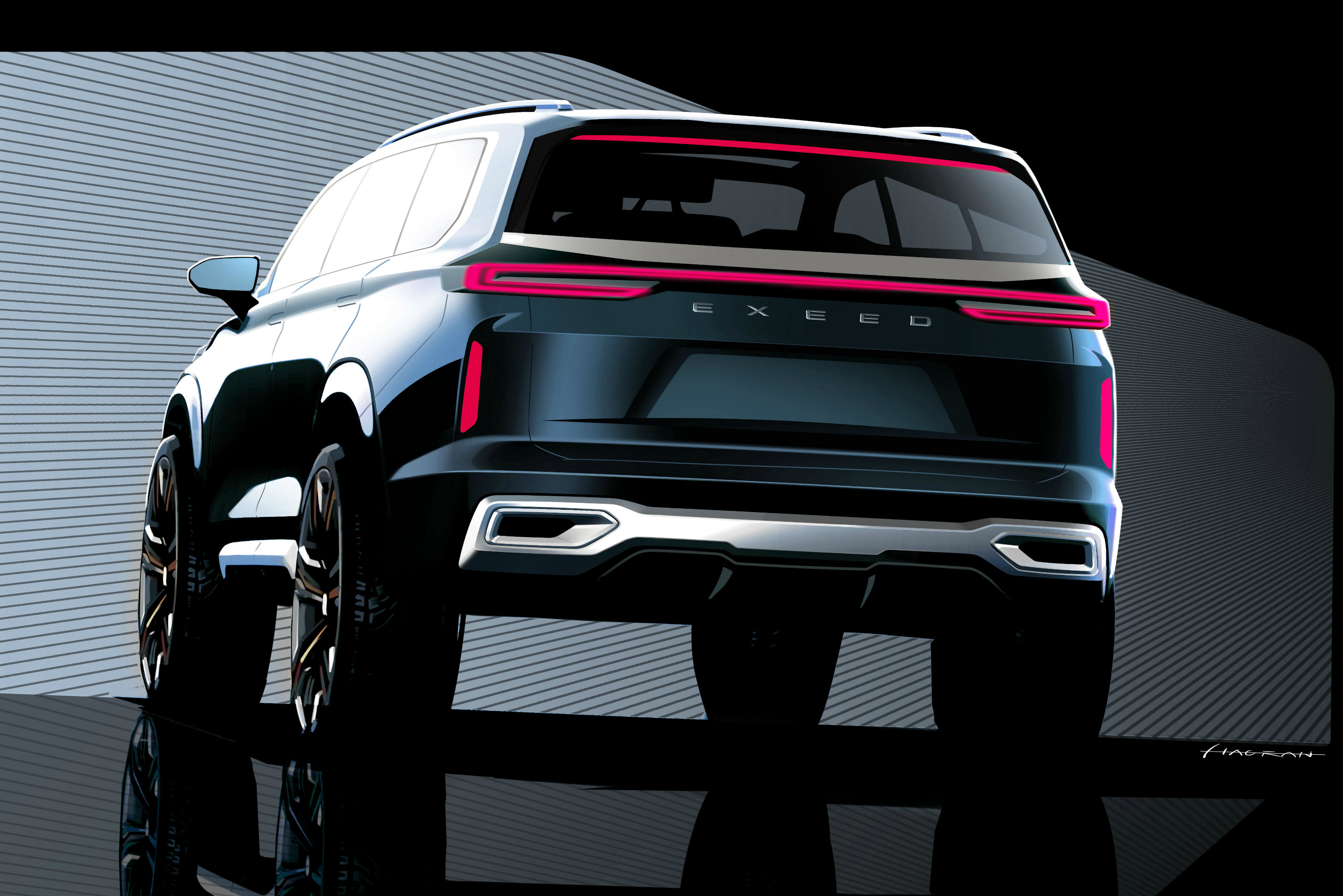 Новоявленный китайский премиум-бренд Exeed представит прототип полноразмерного кроссовера VX 22 ноября на автосалоне в Гуанчжоу. В преддверии дебюта компания показала скетчи новинки.