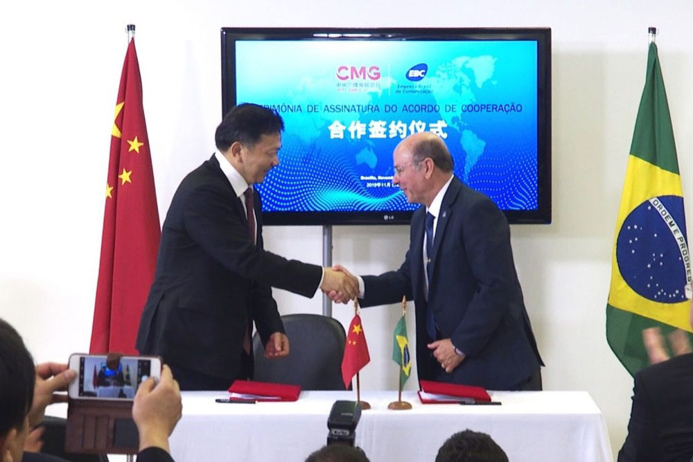 На церемонии подписания соглашения о сотрудничестве присутствовали заместитель руководителя Отдела пропаганды ЦК КПК и директор Медиакорпорации Китая Шэнь Хайсюн и президент Национальной медиа-корпорации Бразилии Луис Гомес (Luiz Gomes).
