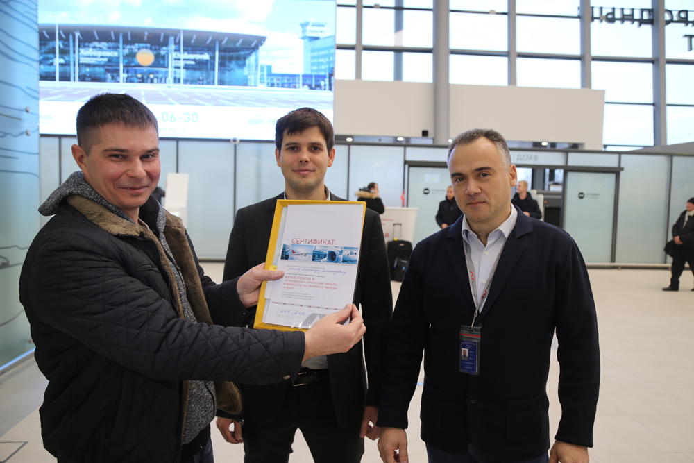 В подарок Александр Капков получил сертификат на бесплатное годовое обслуживание в бизнес-зале терминала и открытый билет туда и обратно по пяти направлениям на выбор: во Владивосток, Южно-Сахалинск, Магадан, Петропавловск-Камчатский или Иркутск.