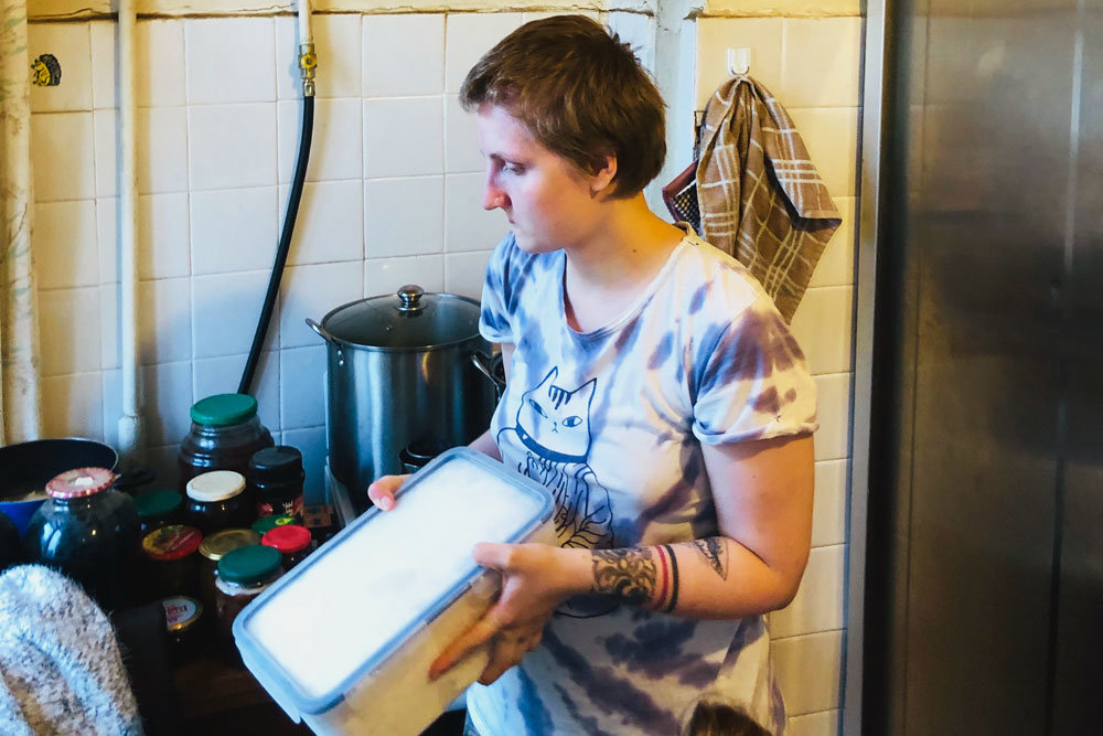 Катя молчит с минуту. Помешивает ложкой суп, кидает специи ("в одну готовку полкило соли уходит", - признается она потом), снимает пенку. Пристально смотрит на меня: "Вы для чего свои материалы пишите? Из-за денег?" Наступает моя очередь молчать. "Уродствующих вокруг стало много, а хочется рассказать о тех, кто не такой", - отвечаю. "Вот! - поднимает она палец. - И я стала задумываться: что за ерунда вокруг? Все злые, агрессивные, ксенофобия сплошная, гомофобия, голод, люди бросаются друг на друга, даже насилие домашнее разрешено. Выходов два: могу сидеть в квартире и писать любимую музыку, а могу выйти и что-то попытаться изменить. Решила выйти на свою голову".